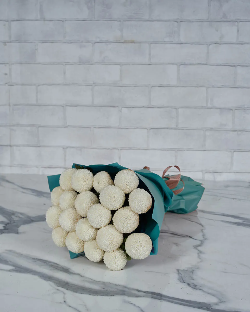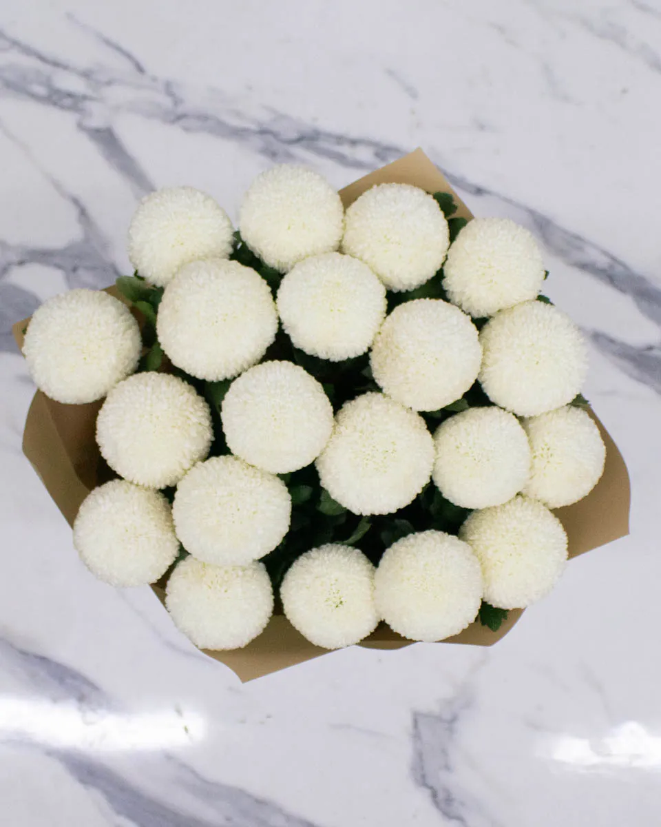 Round, playful blooms in beautiful hues. This white hand-tied bouquet brings a cheerful charm in every color option.